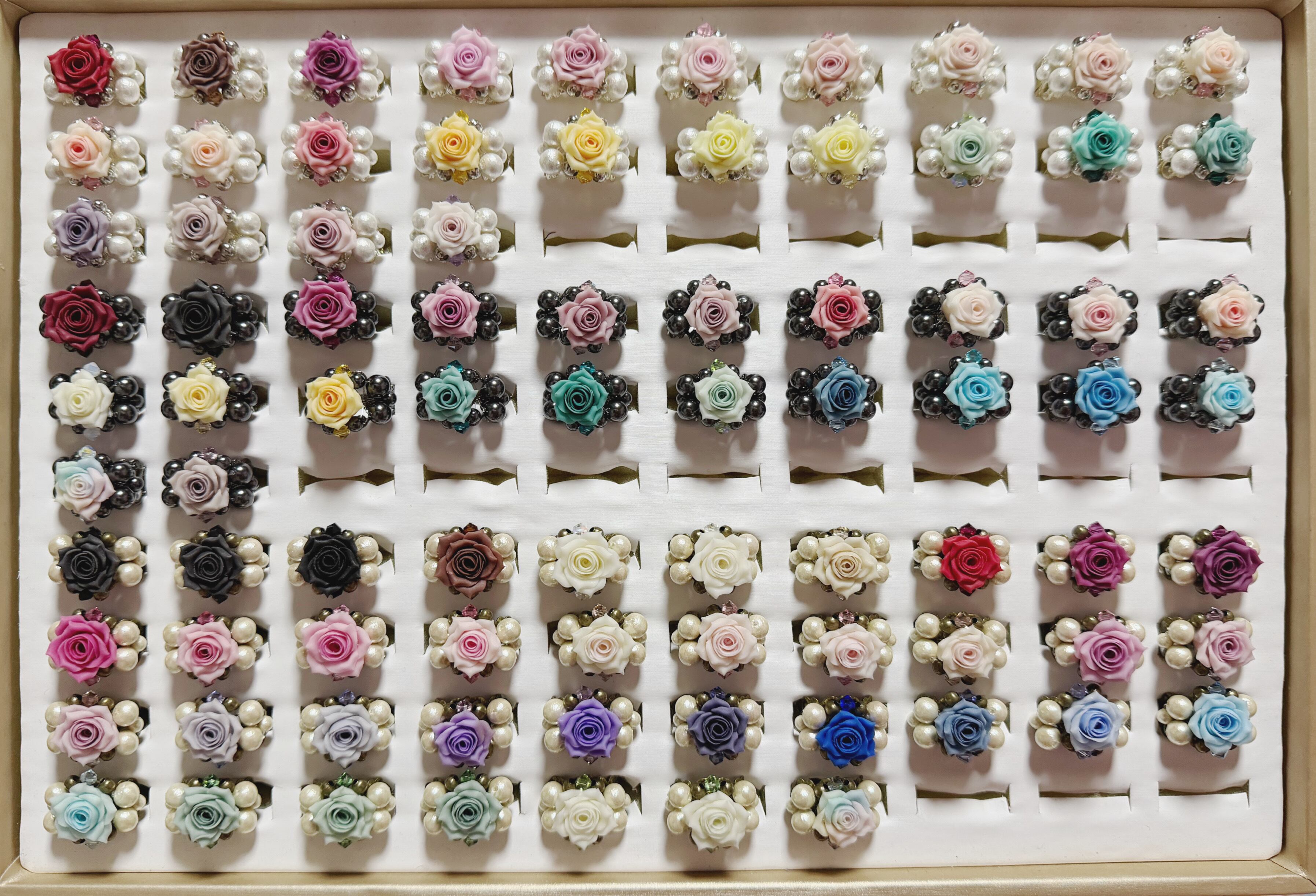 樹脂で出来た花とコットンパール、スワロフスキーストーンをテグスで編んだ、可愛らしいながらも子供っぽくない上品なフリーサイズの、リングとなっています✧*。