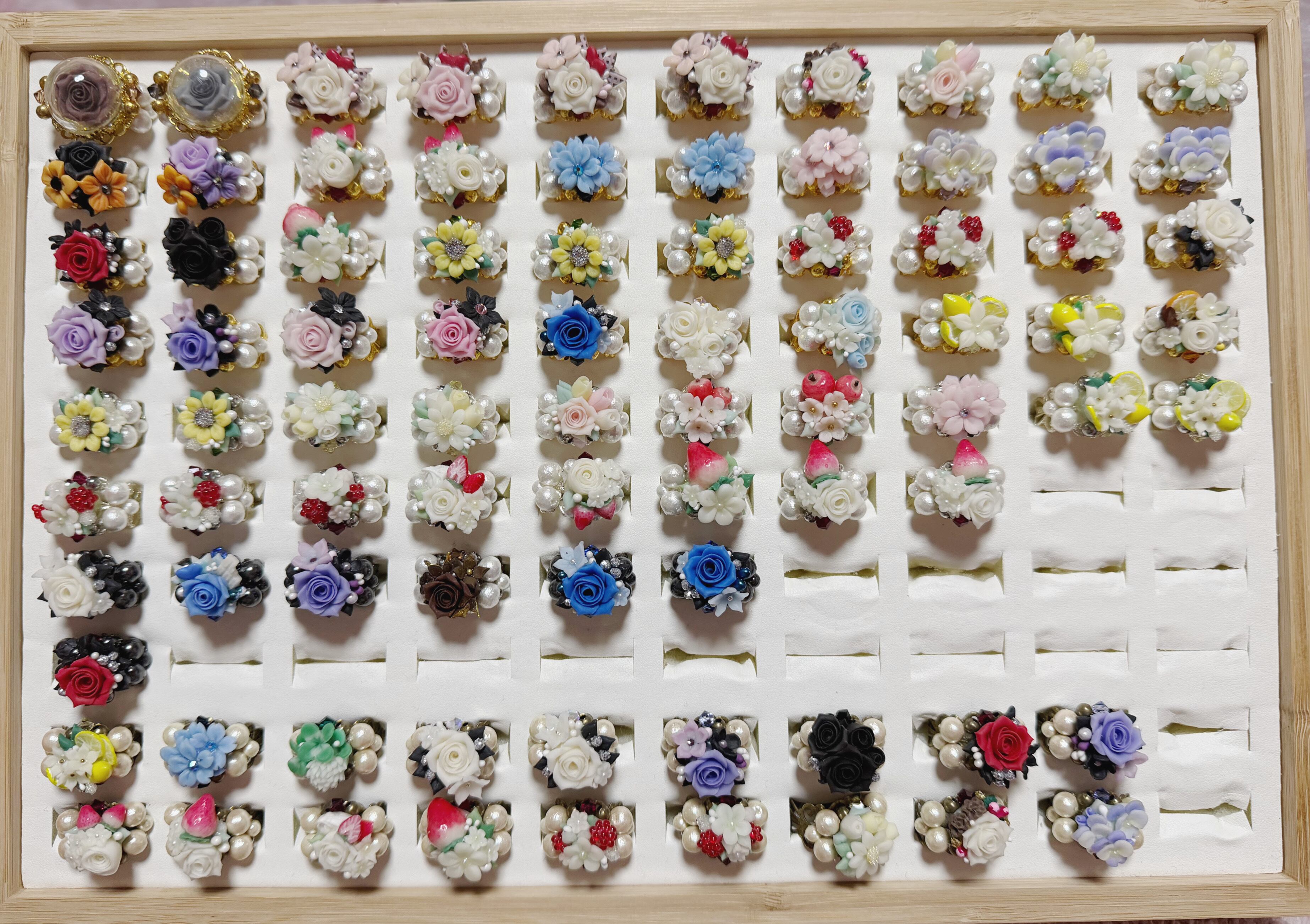 樹脂で出来た花とコットンパール、スワロフスキーストーンをテグスで編んだ、可愛らしいながらも子供っぽくない上品なフリーサイズの、リングとなっています✧*。